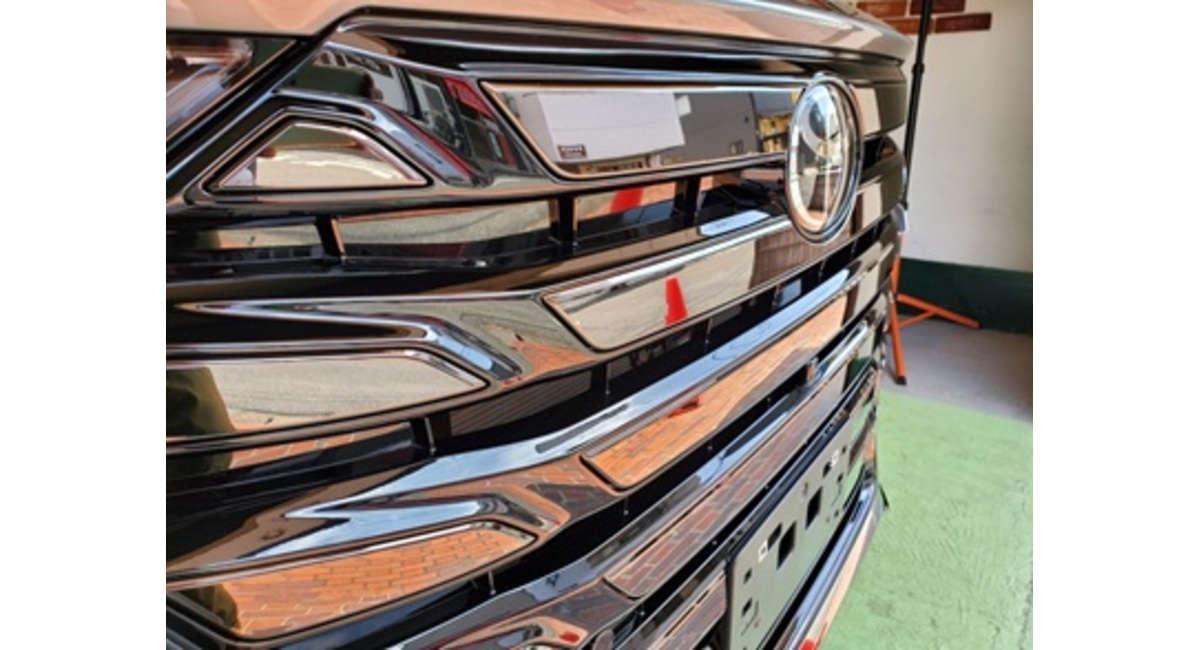 漆黒メッキモールのフロントグリルと窓枠モールさらにリアゲートアンダートリム 鏡面仕上げ ステンレスやサイドメッキには、専用コーティングが必須。