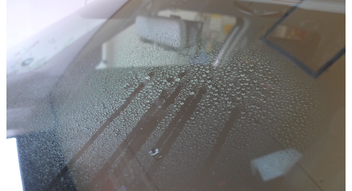 新車なのに水が散乱しながら流れ落ちるフロントガラス(上)もうひとつは、撥水処理したガラス表面を水が弾きしながら流れ落ちていくフロントガラス(下の画像)を比べてみました。