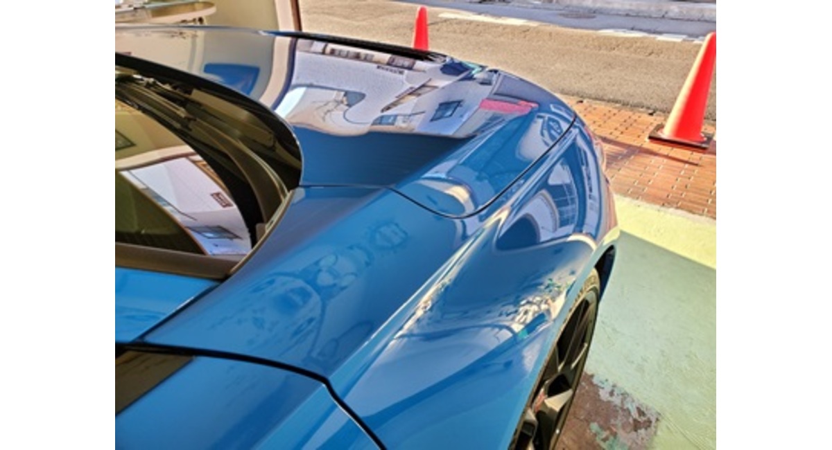 レーシングブルーパールは意外に柔らかい塗装でキズが付きやす上に水抜きに時間がかかるボディデザインため洗車水のシミができやすい欠点があります。