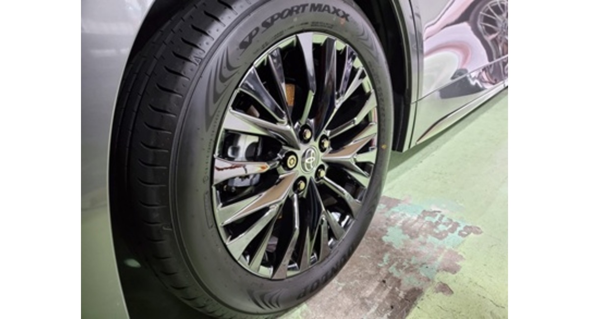 225/55R19タイヤ&19×7Jアルミホイール(ブラックスパッタリング塗装)に4H硬度のホイールコーティングを施工します。