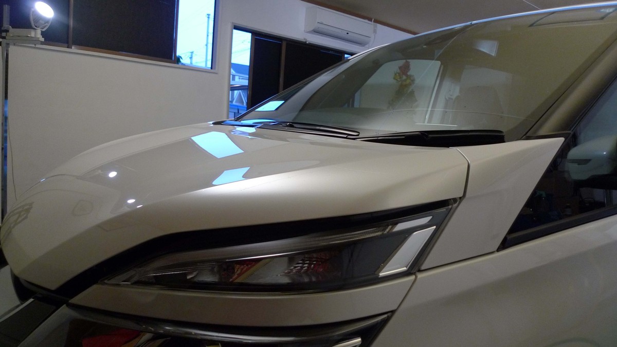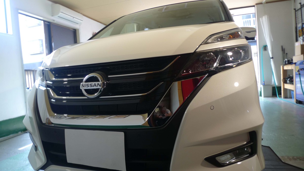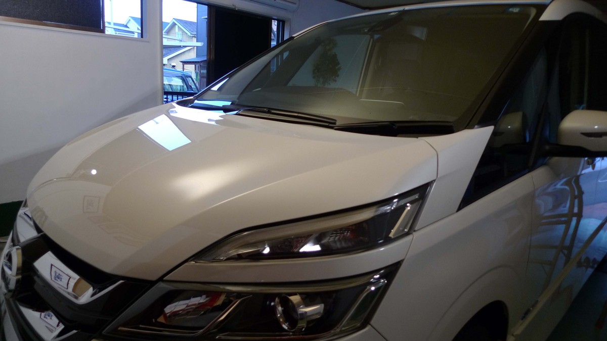 当日は気温が37°にもなり、アツアツのボディを冷却して洗車が始まったのが到着後4時間過ぎてからでした。平成29年の初年度登録車で4000キロ走行車を購入したそうですが、セレナの状態は、お客様に販売されるまでの期間あまり手入れがされていなかったのか、結構傷んでいる部分が目にとまる状態でした。