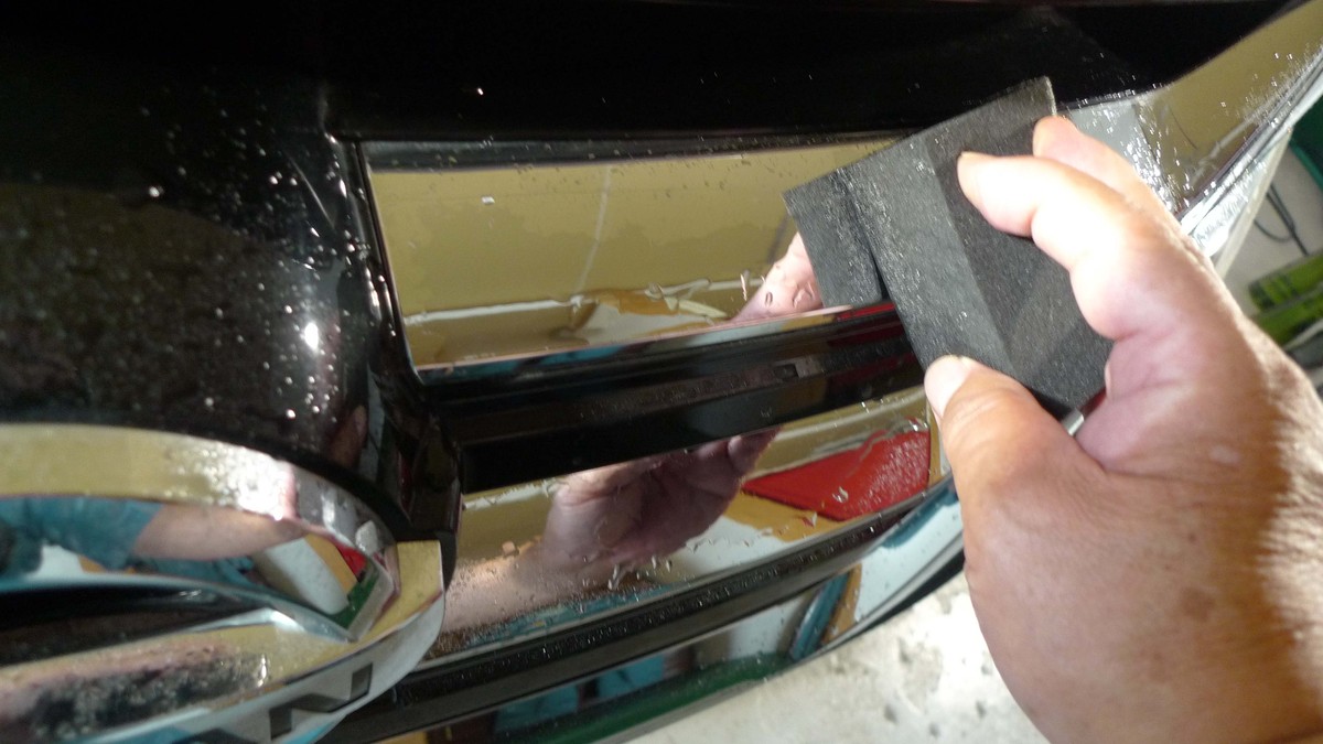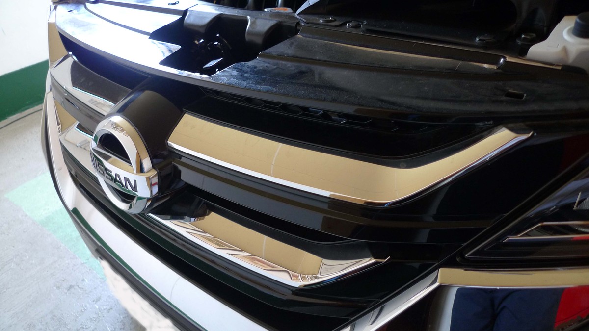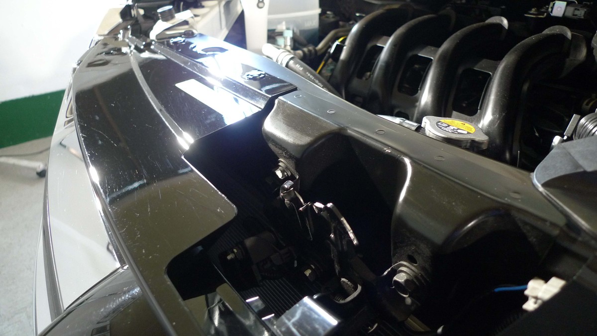 ボンネットフードを開けて、まず目に止まったのがグリル平面部分にできたシミです。めったにボンネットを開けないでしょうが、シミ除去とメッキについた付着物を取り除いてフロントグリル周辺の下地処理が完成です。
