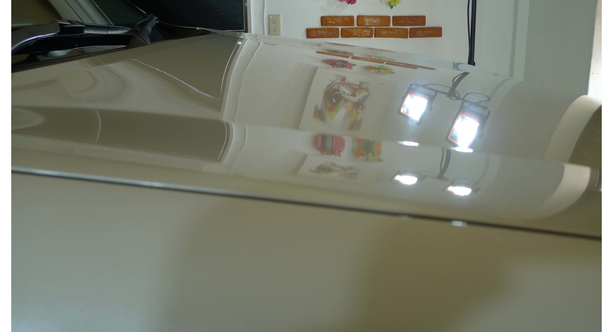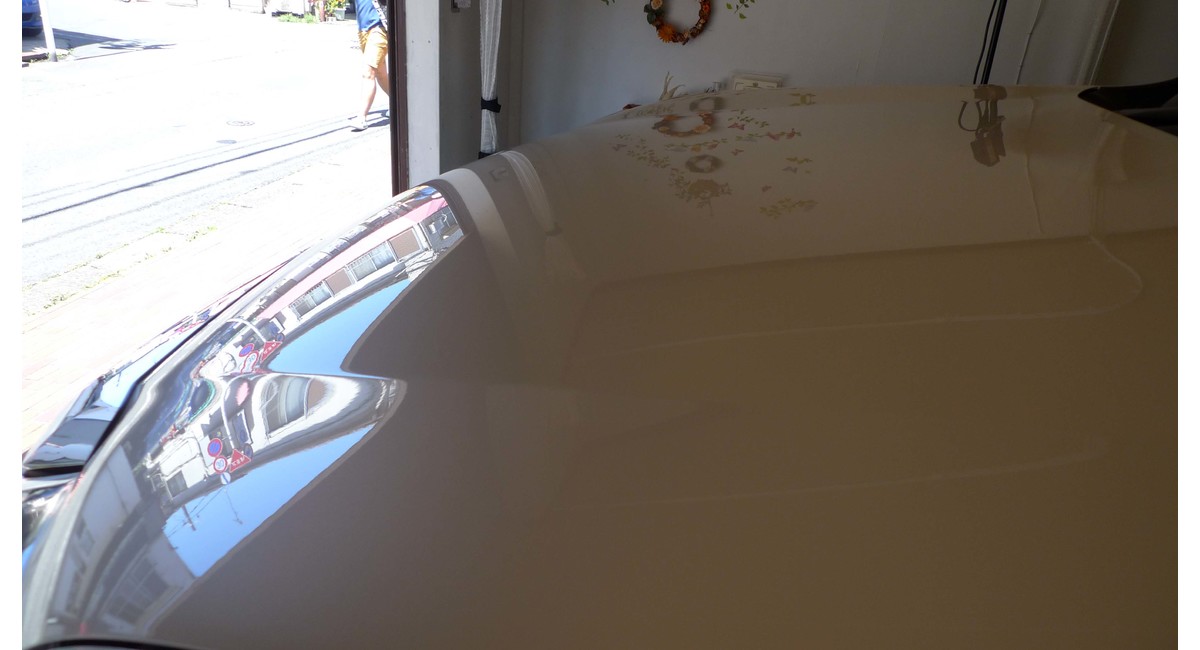 その時の下地処理前後のボンネットの画像ですが、反射する照明の輪郭に違いがあるのがわかると思います。