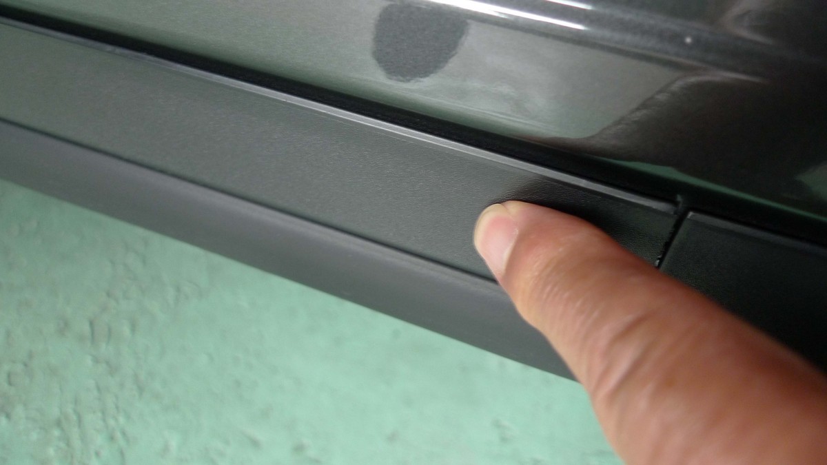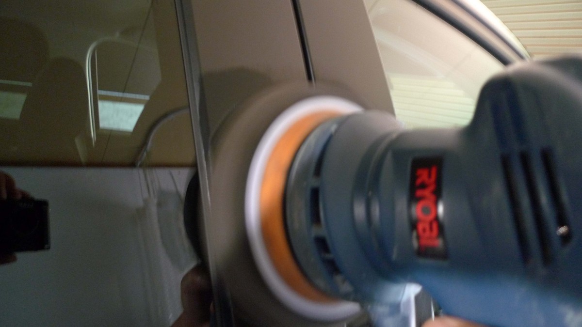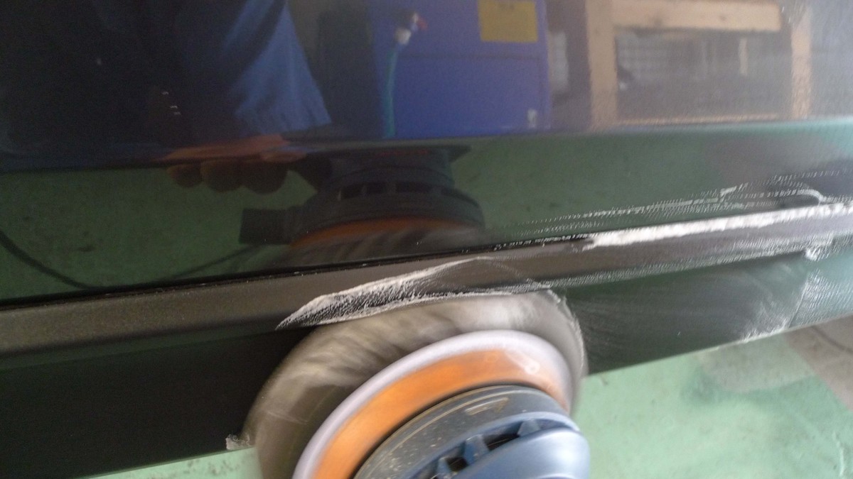 Bピラーにコーティング材を塗布した樹脂表面を艶出しをしている映像です。実はビューティー106では新品の樹脂と劣化が進んでいるパーツとでは、使用するコート材を別なものにしています。