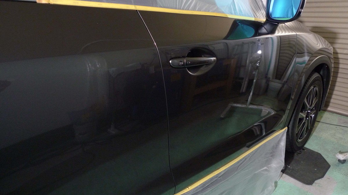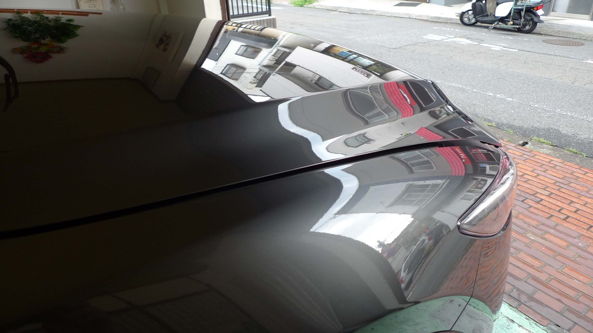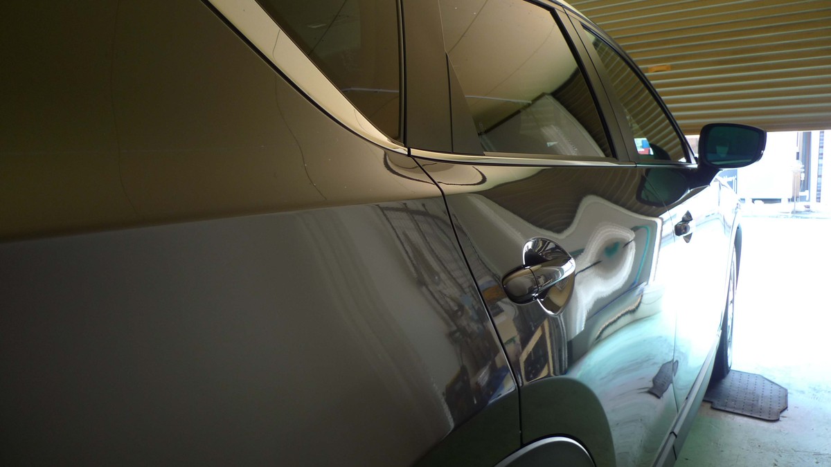 作業開始直前のボディは、水性ワックスで覆われたボンネットやルーフは、洗車水が撥水状態でワックスによる水しみができやすい状態。また右フロントドアやリアバンパーには、直線状の小キズが目立ちました。早速、下地処理作業としてワックスを除去し研磨で傷消しをおこないましたが、最後にボディ全体を活性水と溶剤で水研ぎで仕上げました。