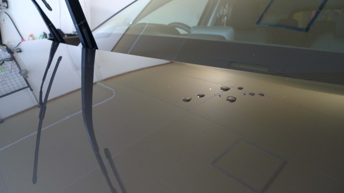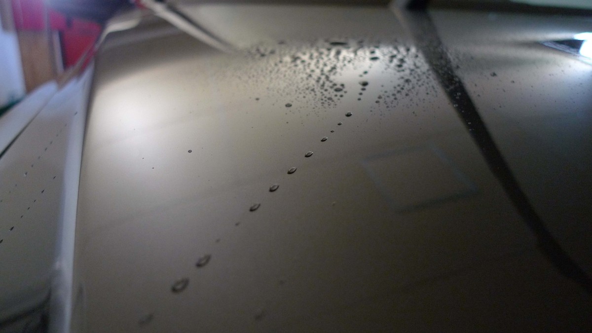 ガラスコーティングが完成した塗装表面は、半年ぐらいかけて大き目の水滴が続きますが、いずれは親水性に変化していく車のコーティングです。